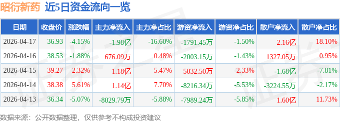 证券之星消息,截至2026年4月17日收盘,昭衍新药(603127)报收于36.93元,下跌4.15%,换手率5.09%,成交量32.06万手,成交额11.91亿元。