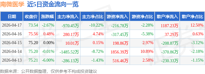 证券之星消息,截至2026年4月17日收盘,南微医学(688029)报收于73.54元,下跌2.67%,换手率0.68%,成交量1.28万手,成交额9499.46万元。