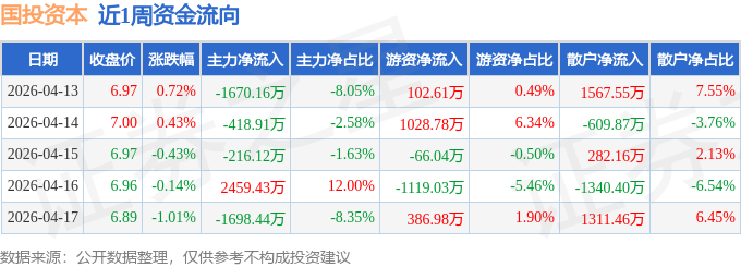 资金流向数据方面,本周国投资本主力资金合计净流出1544.21万元,游资资金合计净流入333.3万元,散户资金合计净流入1210.91万元。本周资金流向一览见下表: