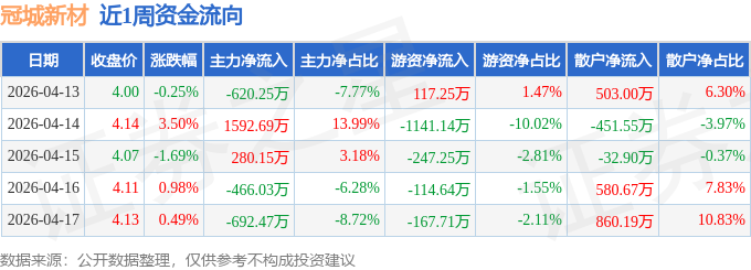 资金流向数据方面,本周冠城新材主力资金合计净流入94.09万元,游资资金合计净流出1553.49万元,散户资金合计净流入1459.4万元。本周资金流向一览见下表: