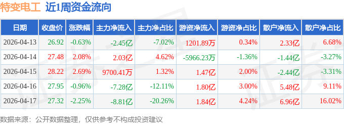 资金流向数据方面,本周特变电工主力资金合计净流出15.53亿元,游资资金合计净流入4.64亿元,散户资金合计净流入10.89亿元。本周资金流向一览见下表: