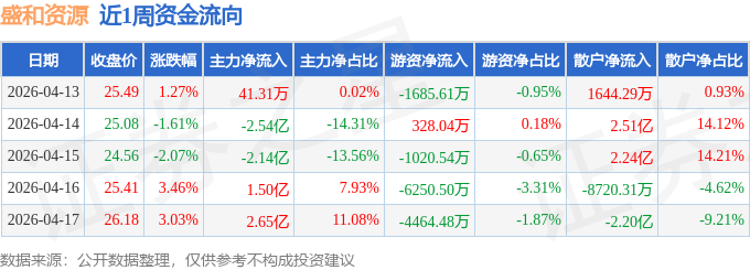 资金流向数据方面,本周盛和资源主力资金合计净流出5283.81万元,游资资金合计净流出1.31亿元,散户资金合计净流入1.84亿元。本周资金流向一览见下表: