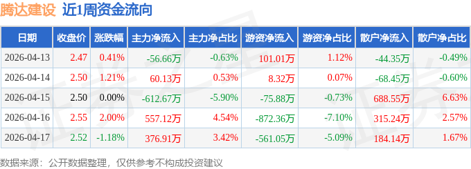 资金流向数据方面,本周腾达建设主力资金合计净流入324.83万元,游资资金合计净流出1399.96万元,散户资金合计净流入1075.13万元。本周资金流向一览见下表: