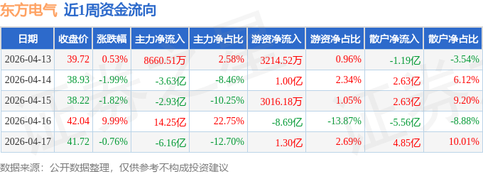 资金流向数据方面,本周东方电气主力资金合计净流入2.39亿元,游资资金合计净流出5.76亿元,散户资金合计净流入3.37亿元。本周资金流向一览见下表: