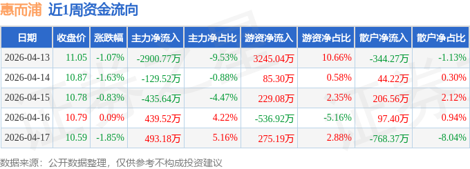 资金流向数据方面,本周惠而浦主力资金合计净流出2533.23万元,游资资金合计净流入3297.69万元,散户资金合计净流出764.46万元。本周资金流向一览见下表:
