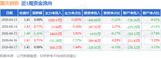 证券之星消息,截至2026年4月17日收盘,重庆钢铁(601005)报收于1.41元,较上周的1.41元上涨0.0%。本周,重庆钢铁4月15日盘中最高价报1.43元。4月13日盘中最低价报1.4元。重庆钢铁当前最新总市值124.81亿元,在普钢板块市值排名12/23,在两市A股市值排名1672/5198。