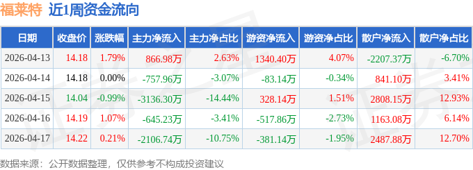 资金流向数据方面,本周福莱特主力资金合计净流出5779.24万元,游资资金合计净流入686.4万元,散户资金合计净流入5092.84万元。本周资金流向一览见下表: