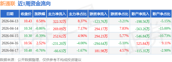 资金流向数据方面,本周新通联主力资金合计净流入546.2万元,游资资金合计净流入351.98万元,散户资金合计净流出898.18万元。本周资金流向一览见下表:
