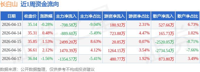 资金流向数据方面,本周长白山主力资金合计净流入1016.83万元,游资资金合计净流入2670.57万元,散户资金合计净流出3687.4万元。本周资金流向一览见下表:
