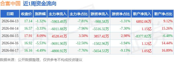 资金流向数据方面,本周合富中国主力资金合计净流出2.19亿元,游资资金合计净流出9804.97万元,散户资金合计净流入3.17亿元。本周资金流向一览见下表: