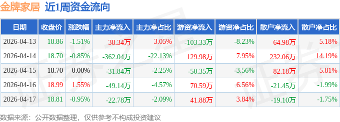 资金流向数据方面,本周金牌家居主力资金合计净流出427.46万元,游资资金合计净流入88.78万元,散户资金合计净流入338.68万元。本周资金流向一览见下表: