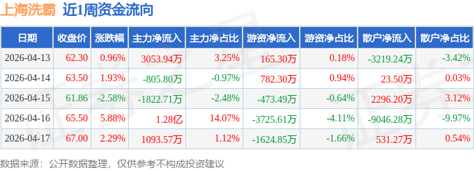 资金流向数据方面,本周上海洗霸主力资金合计净流入1.43亿元,游资资金合计净流出4876.35万元,散户资金合计净流出9414.54万元。本周资金流向一览见下表: