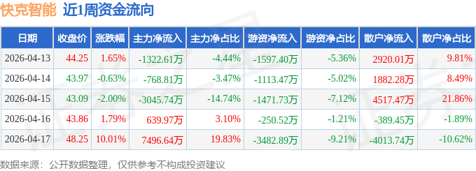 资金流向数据方面,本周快克智能主力资金合计净流入2999.45万元,游资资金合计净流出7916.01万元,散户资金合计净流入4916.56万元。本周资金流向一览见下表: