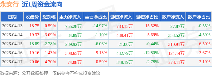 资金流向数据方面,本周永安行主力资金合计净流出747.36万元,游资资金合计净流入419.59万元,散户资金合计净流入327.77万元。本周资金流向一览见下表: