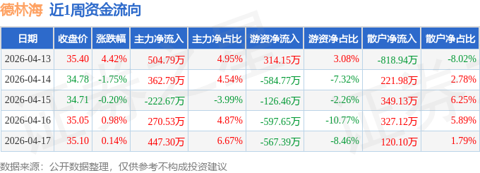 资金流向数据方面,本周德林海主力资金合计净流入1362.73万元,游资资金合计净流出1562.11万元,散户资金合计净流入199.39万元。本周资金流向一览见下表:
