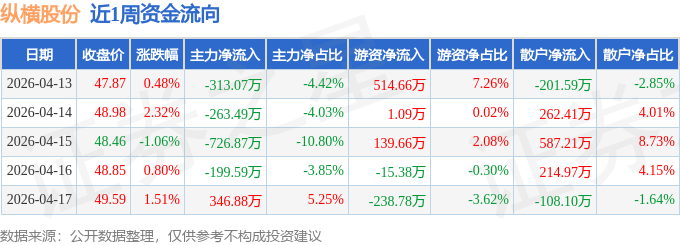 资金流向数据方面,本周纵横股份主力资金合计净流出1156.15万元,游资资金合计净流入401.24万元,散户资金合计净流入754.91万元。本周资金流向一览见下表: