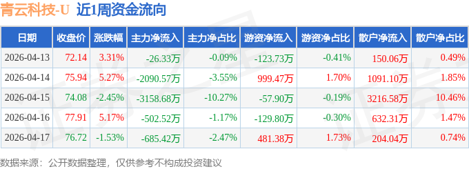 资金流向数据方面,本周青云科技主力资金合计净流出6463.5万元,游资资金合计净流入1169.42万元,散户资金合计净流入5294.09万元。本周资金流向一览见下表: