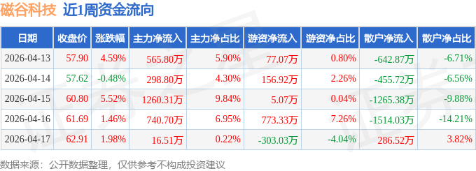 资金流向数据方面,本周磁谷科技主力资金合计净流入2882.11万元,游资资金合计净流入709.37万元,散户资金合计净流出3591.48万元。本周资金流向一览见下表: