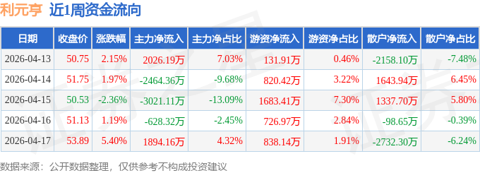 资金流向数据方面,本周利元亨主力资金合计净流出2193.44万元,游资资金合计净流入4200.86万元,散户资金合计净流出2007.42万元。本周资金流向一览见下表: