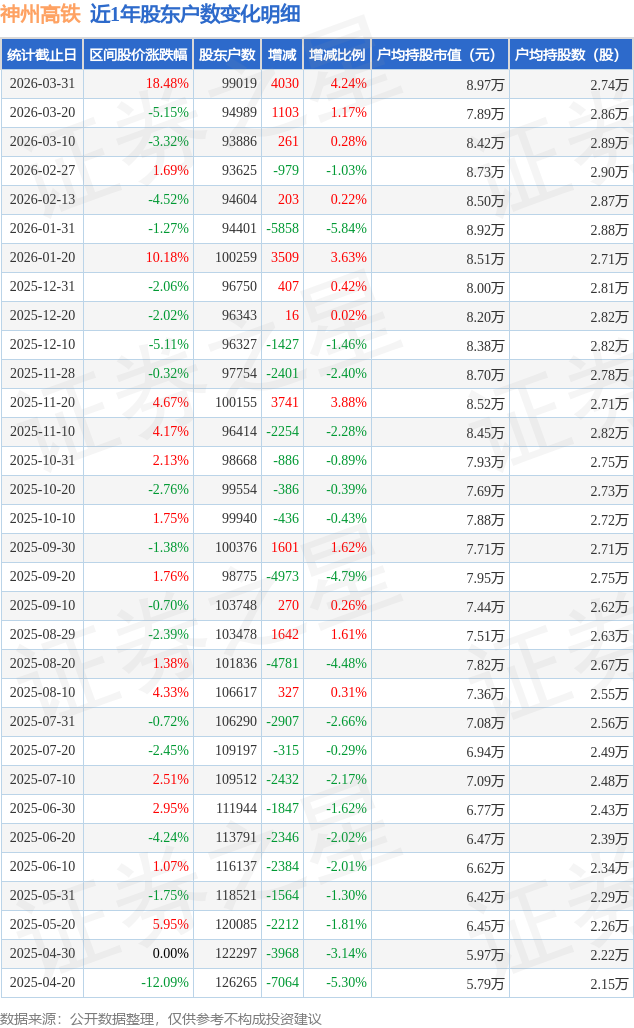 从股价来看,2026年3月20日至2026年3月31日,神州高铁区间涨幅为18.48%,在此期间股东户数增加4030.0户,增幅为4.24%。
