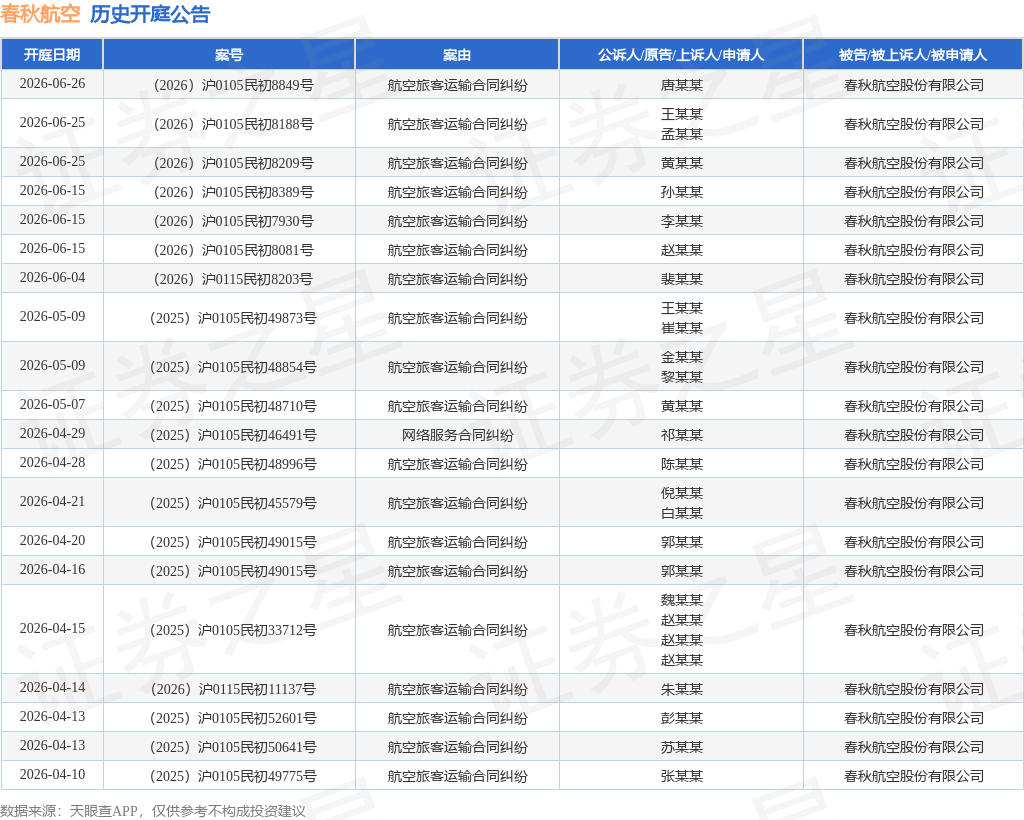 案号:(2025)沪0105民初45579号根据统计,近一年内以春秋航空股份有限公司为当事人的历史开庭公告有221则,其中案由为“航空旅客运输合同纠纷”的公告以178则居首,其次为“劳动合同纠纷”有14则,“网络服务合同纠纷”有14则。历史开庭公告(前20条)如下: