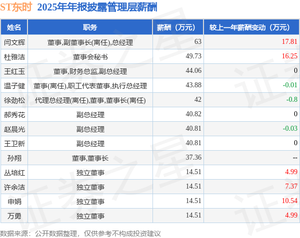 证券之星消息,ST东时发布2025年年报,数据显示:公司主营收入6.18亿元,同比减23.47%。归母净利润为-7.45亿元,同比增17.41%。扣非净利润为-6.8亿元,同比减11.84%。当年公司员工总数2111人,同比减6.01%。人均薪酬14.93万元(注:"人均薪酬"根据定期报告中"应付职工薪酬"附注的本期增加值 / 员工总数计算而来),同比增3.34%。人均创收29.27万元,同比减18.58%。其中管理层薪酬总额为460.51万元,同比上一年减2.96%,薪酬最高的为董事,副董事长(离任),总经理闫文辉,薪酬63.0万元。