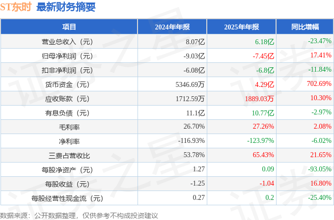 据证券之星公开数据整理,近期ST东时(603377)发布2025年年报。截至本报告期末,公司营业总收入6.18亿元,同比下降23.47%,归母净利润-7.45亿元,同比上升17.41%。按单季度数据看,第四季度营业总收入1.21亿元,同比下降19.26%,第四季度归母净利润-6.43亿元,同比上升18.99%。本报告期ST东时短期债务压力上升,流动比率达0.27。