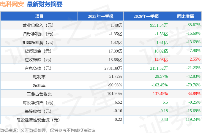 据证券之星公开数据整理,近期电科网安(002268)发布2026年一季报。截至本报告期末,公司营业总收入9551.34万元,同比下降35.67%,归母净利润-1.56亿元,同比下降15.69%。按单季度数据看,第一季度营业总收入9551.34万元,同比下降35.67%,第一季度归母净利润-1.56亿元,同比下降15.69%。本报告期电科网安三费占比上升明显,财务费用、销售费用和管理费用总和占总营收同比增幅达34.89%。