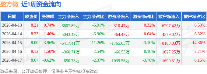 资金流向数据方面,本周盈方微主力资金合计净流出1.97亿元,游资资金合计净流出2096.8万元,散户资金合计净流入2.18亿元。本周资金流向一览见下表: