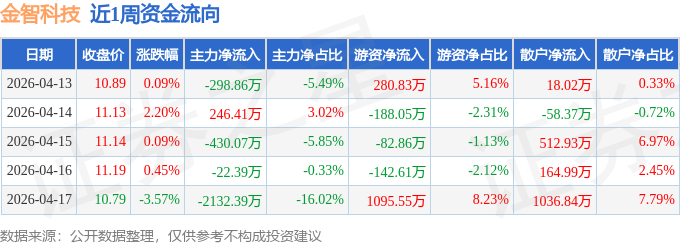 资金流向数据方面,本周金智科技主力资金合计净流出2637.3万元,游资资金合计净流入962.88万元,散户资金合计净流入1674.42万元。本周资金流向一览见下表: