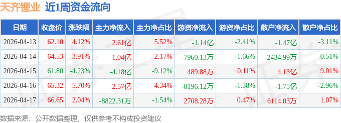 资金流向数据方面,本周天齐锂业主力资金合计净流入1.16亿元,游资资金合计净流出2.43亿元,散户资金合计净流入1.27亿元。本周资金流向一览见下表: