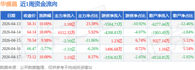 资金流向数据方面,本周华盛昌主力资金合计净流出5302.93万元,游资资金合计净流入705.29万元,散户资金合计净流入4597.63万元。本周资金流向一览见下表: