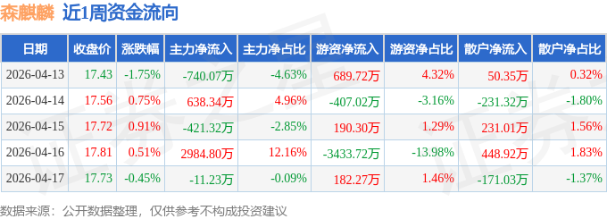 资金流向数据方面,本周森麒麟主力资金合计净流入2450.52万元,游资资金合计净流出2778.45万元,散户资金合计净流入327.93万元。本周资金流向一览见下表: