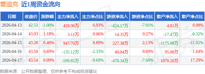 资金流向数据方面,本周雷迪克主力资金合计净流入635.2万元,游资资金合计净流出612.75万元,散户资金合计净流出22.45万元。本周资金流向一览见下表: