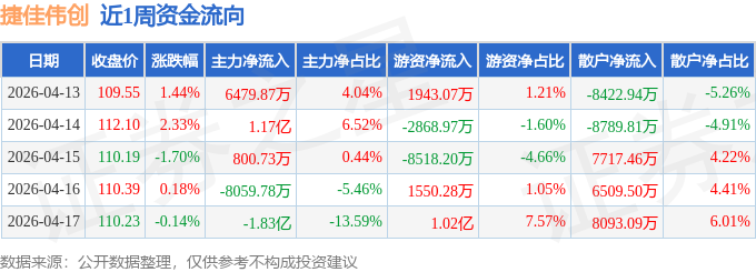 资金流向数据方面,本周捷佳伟创主力资金合计净流出7404.14万元,游资资金合计净流入2296.84万元,散户资金合计净流入5107.3万元。本周资金流向一览见下表: