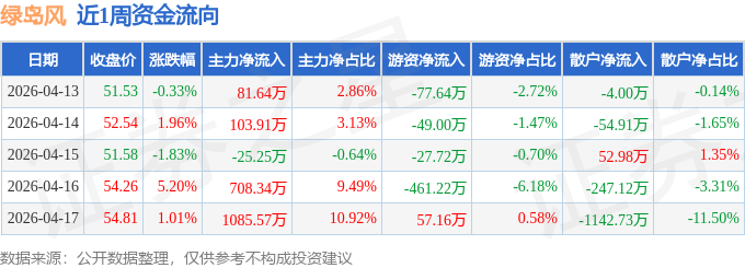资金流向数据方面,本周绿岛风主力资金合计净流入1954.22万元,游资资金合计净流出558.43万元,散户资金合计净流出1395.79万元。本周资金流向一览见下表: