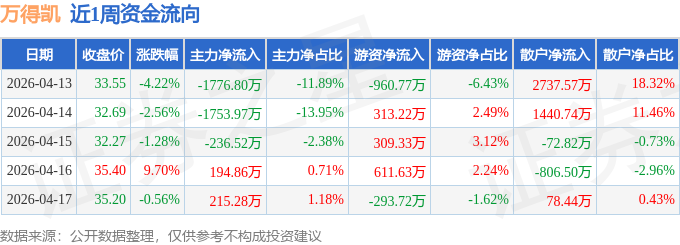 资金流向数据方面,本周万得凯主力资金合计净流出3357.13万元,游资资金合计净流出20.3万元,散户资金合计净流入3377.43万元。本周资金流向一览见下表: