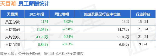 证券之星消息,4月20日天目湖公布2025年年报,当年营收5.08亿元,同比减5.25%;净利润为9532.11万元,同比减8.92%。根据财报数据披露,当年公司员工总数1174人,同比减5.02%;人均薪酬11.05万元,同比减2.98%;人均创收43.28万元,同比减0.24%;人均创利8.84万元,同比减9.63%;公司员工薪酬统计见下表: