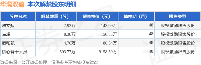 证券之星消息,根据市场公开信息整理,华润双鹤(600062)于4月20日将有524.75万股限售股份解禁,为公司股权激励限售股份,占公司总股本0.51%。(本次数据根据历史公告整理得出,实际情况以上市公司最新公告为准)最近一年内,该股累计解禁34.71万股,占总股本的0.03%。本次解禁后,公司还有35.71万股限售股份,占总股本0.03%。具体如下图所示:
