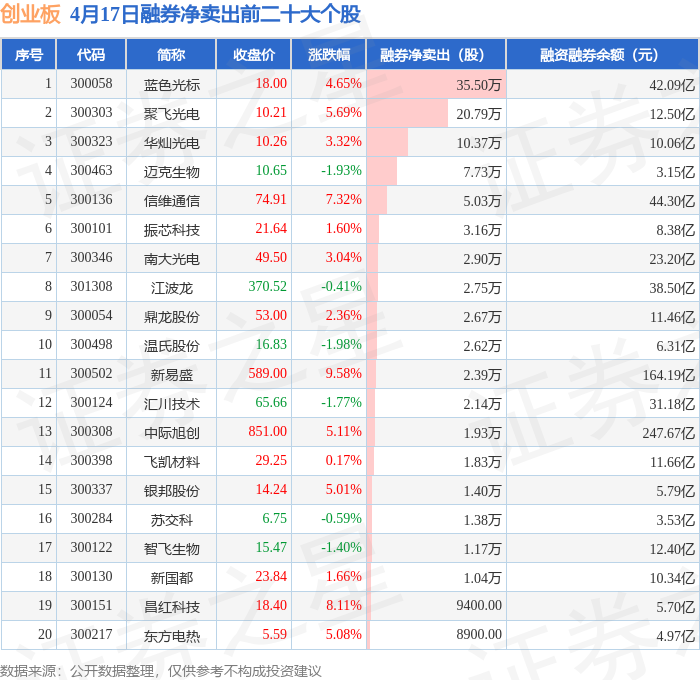创业板融券净卖出前三分别为:蓝色光标(300058)融券净卖出35.5万股、聚飞光电(300303)融券净卖出20.79万股、华灿光电(300323)融券净卖出10.37万股,前20具体见下表: