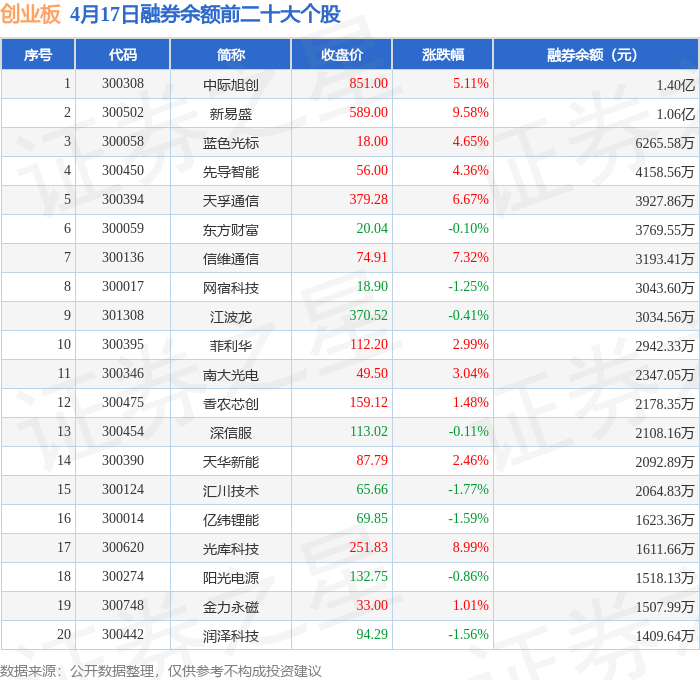 创业板融券余额前三分别为:中际旭创(300308)融券余额1.4亿元、新易盛(300502)融券余额1.06亿元、蓝色光标(300058)融券余额6265.58万元,前20具体见下表: