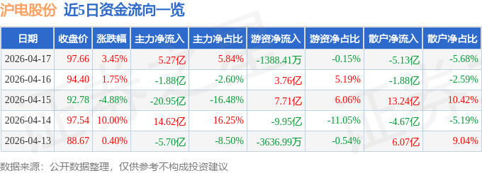 证券之星消息,截至2026年4月17日收盘,沪电股份(002463)报收于97.66元,上涨3.45%,换手率4.84%,成交量93.02万手,成交额90.23亿元。
