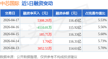 证券之星消息,4月17日,中芯国际(688981)融资买入8.28亿元,融资偿还7.75亿元,融资净买入5308.29万元,融资余额116.45亿元。