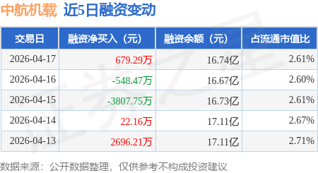 证券之星消息,4月17日,中航机载(600372)融资买入5557.6万元,融资偿还4878.31万元,融资净买入679.29万元,融资余额16.74亿元。