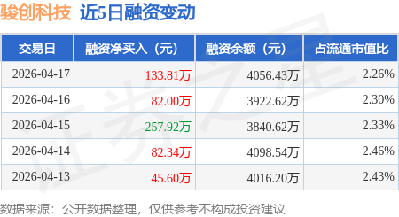 证券之星消息,4月17日,骏创科技(920533)融资买入526.93万元,融资偿还393.12万元,融资净买入133.81万元,融资余额4056.43万元。