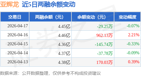 证券之星消息,4月17日,亚辉龙(688575)融资买入522.38万元,融资偿还549.01万元,融资净卖出26.63万元,融资余额4.43亿元。