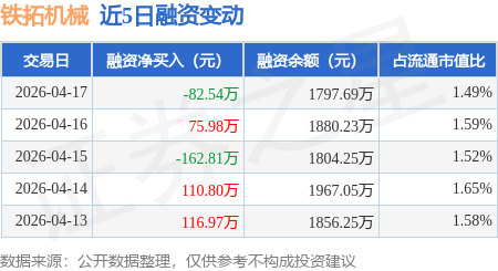 证券之星消息,4月17日,铁拓机械(920706)融资买入266.06万元,融资偿还348.6万元,融资净卖出82.54万元,融资余额1797.69万元。