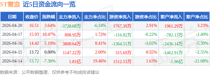 证券之星消息,截至2026年4月20日收盘,ST雪浪(300385)报收于16.51元,上涨3.64%,换手率12.58%,成交量36.56万手,成交额6.07亿元。