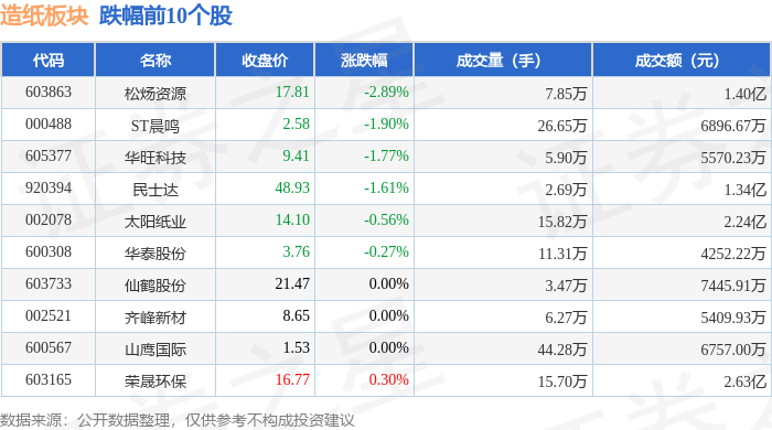 证券之星消息,4月20日造纸板块较上一交易日上涨1.44%,冠豪高新领涨。当日上证指数报收于4082.13,上涨0.76%。深证成指报收于14966.75,上涨0.55%。造纸板块个股涨跌见下表: