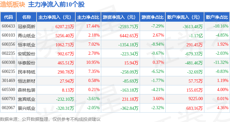 从资金流向上来看,当日造纸板块主力资金净流入1677.7万元,游资资金净流入5221.53万元,散户资金净流出6899.23万元。造纸板块个股资金流向见下表: